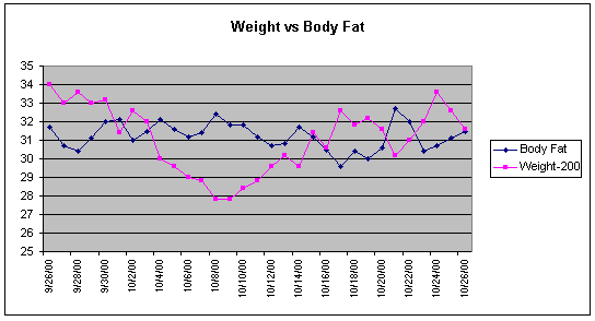Well, here's a new one, and it's ever so obvious that there's an inverse relationship. The two measurements track so closely that it's almost eerie. I created the chart by subtracting 200 from my weight and charting it against body fat.