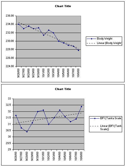 Note that my body weight has sharply decreased, while my BFI, on average has increased. I include trendlines to make this obvious. Since I've only been doing the diet since last Monday, it's not a good idea to read much into the charts so far.