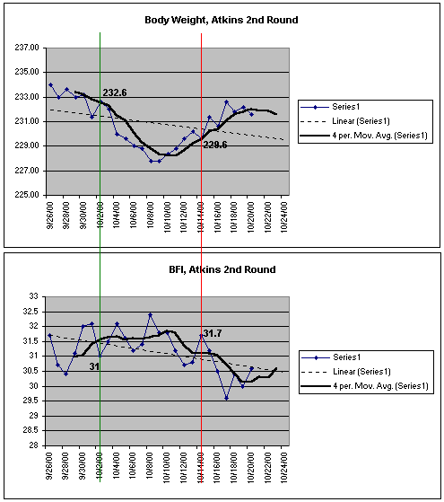 What's particularly interesting to me is that the low point of my weight, 227.8, is reached midway through the diet period. After that point, I start climbing back up. A possible explanation for this is that on 10/01 I started weight training again. I don't really think I put on 1.8lbs of muscle during the diet, but it is a small possibility.