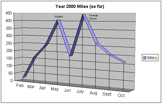 I've been keeping a detailed spreadsheet of ride data since I started training for the TOSRV back in February. I intend to keep this log up as long as I ride. Being a total geek, I like to do analysis on the collected data from time to time. In that spirit, here's my approximate miles-per-month for the year 2000. My total miles as of today is 2,104.